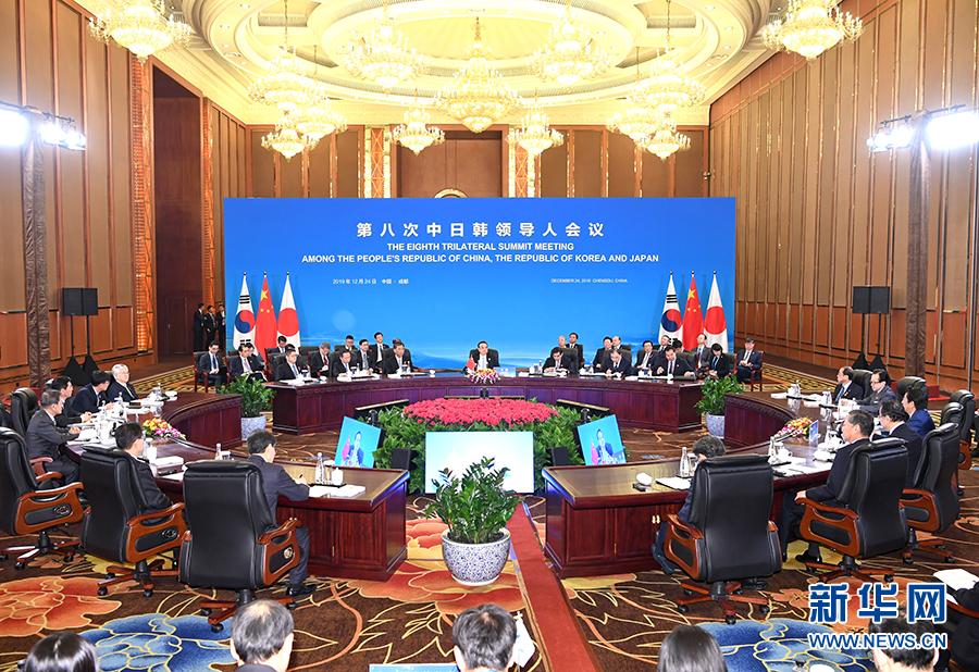 12月24日,國務院總理李克強在成都與韓國總統(tǒng)文在寅、日本首相安倍晉三共同出席第八次中日韓領導人會議。新華社記者 張領 攝