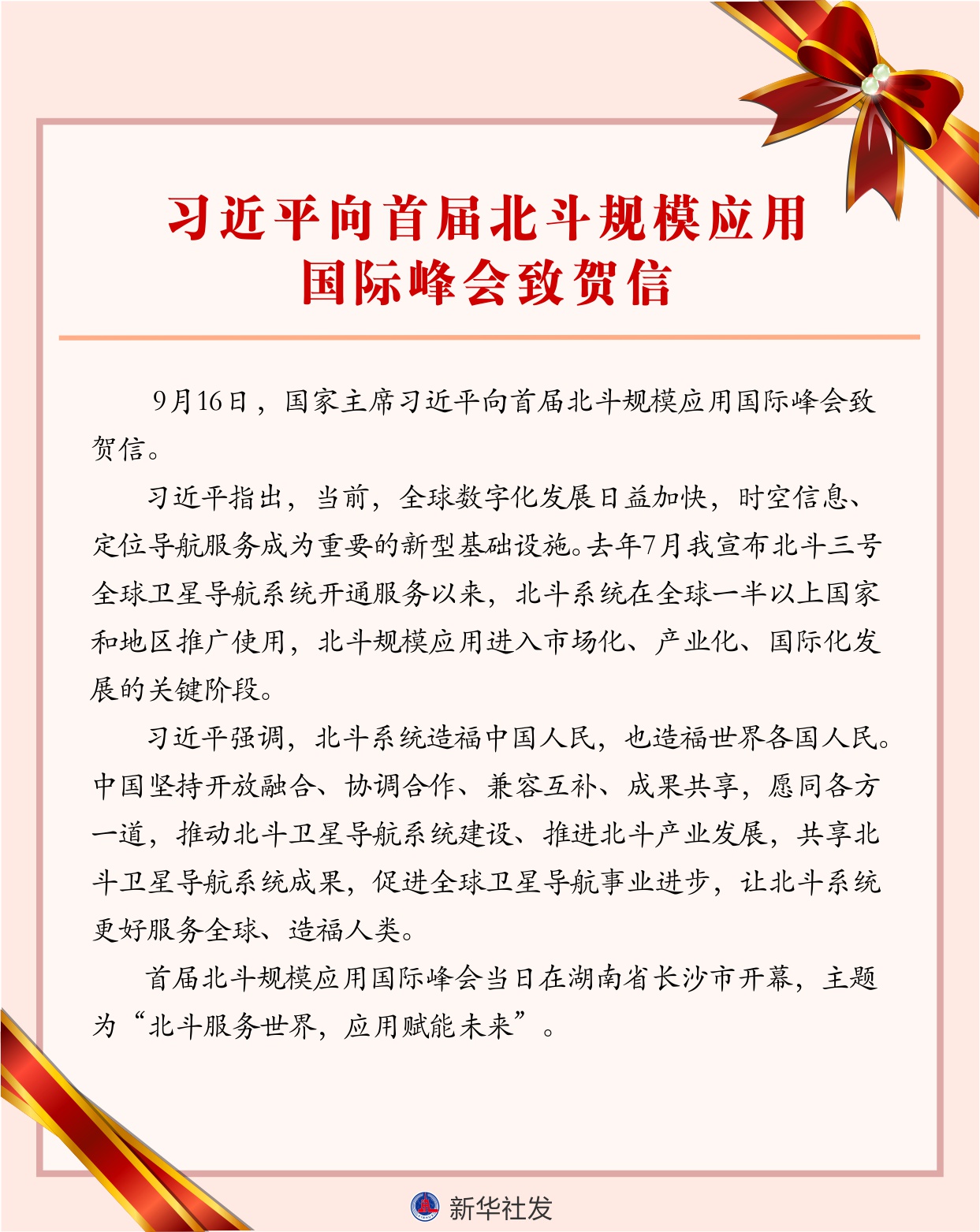新華社北京9月16日電 9月16日,國家主席習(xí)近平向首屆北斗規(guī)模應(yīng)用國際峰會致賀信。