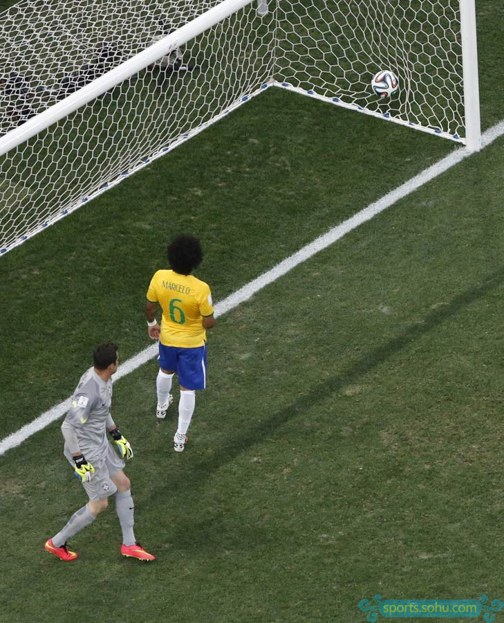第10分鐘,奧利奇左路突進20米后傳中,皮球從貼防的蒂亞戈-席爾瓦兩腿間鉆過,皮球劃過門前,耶拉維奇前點觸碰到皮球,身后的路易斯未能攔截到皮球,還干擾了后點的馬塞洛,皇馬邊衛(wèi)不慎將球擋入自家球門,1-0,克羅地亞憑借馬塞洛的烏龍球幸運取得領先。馬塞洛的烏龍球竟然是巴西參加世界杯歷史上的第一個烏龍球。