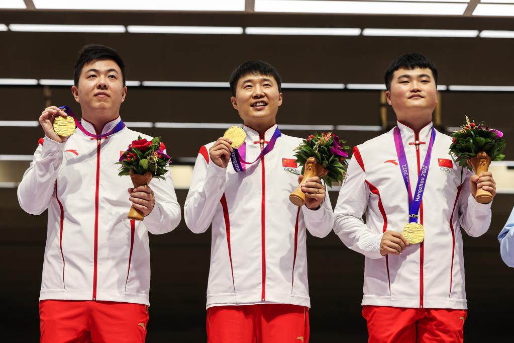 男子25米手槍速射個(gè)人資格賽即為團(tuán)體決賽,每隊(duì)三名選手的個(gè)人成績(jī)相加即為團(tuán)體賽成績(jī)。中國(guó)隊(duì)三名選手資格賽成績(jī)排在前三,1765環(huán)的總成績(jī)打破了由中國(guó)隊(duì)自己在2018年創(chuàng)造的世界紀(jì)錄。