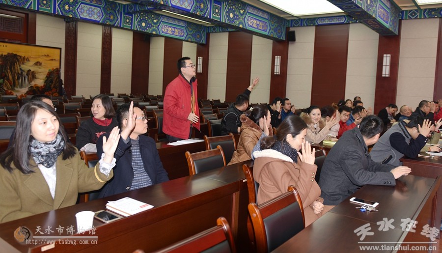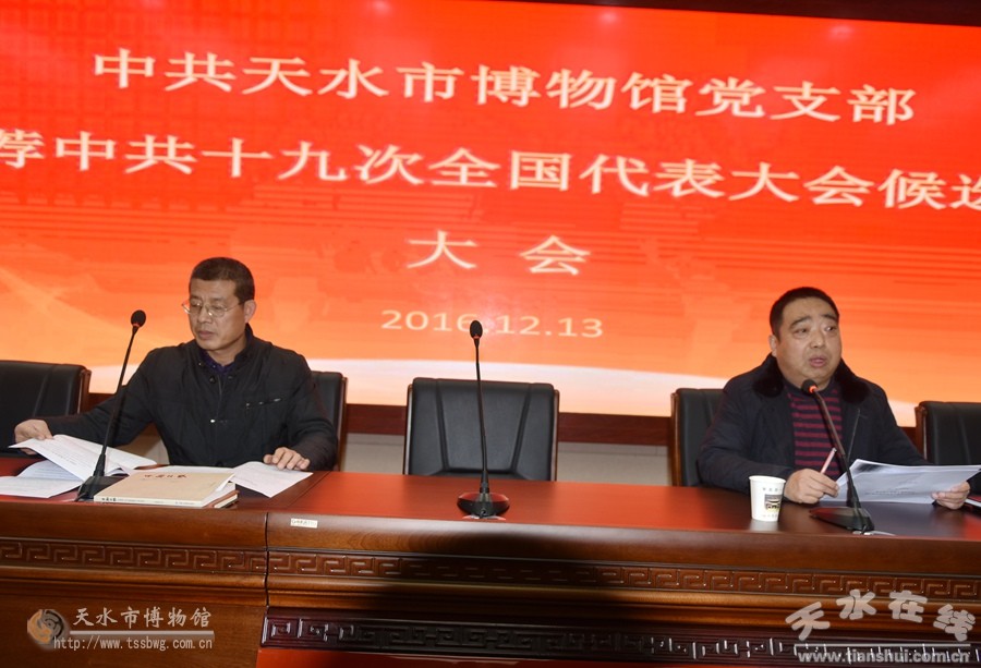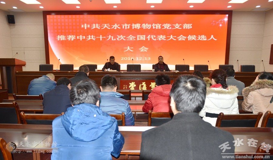 12月13日,天水市博物館在明道堂召開中共天水市博物館黨支部推薦中共十九次全國代表大會候選人大會。副館長管玉、汪保全和各部室主任、黨員共38人參加了會議。會議選舉劉復興同志為中共天水市博物館黨支部推薦的中共十九次全國代表大會候選人初步人選。