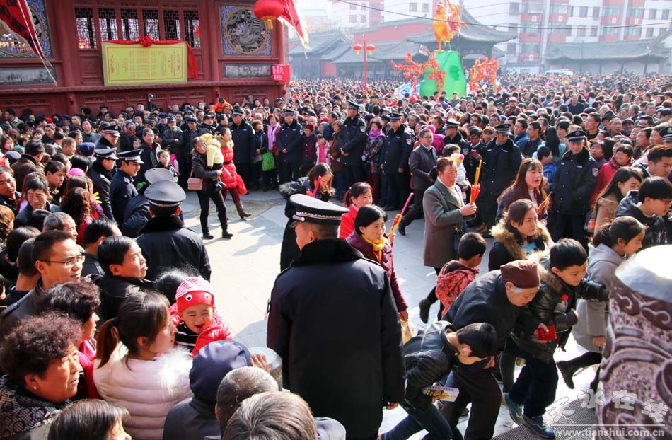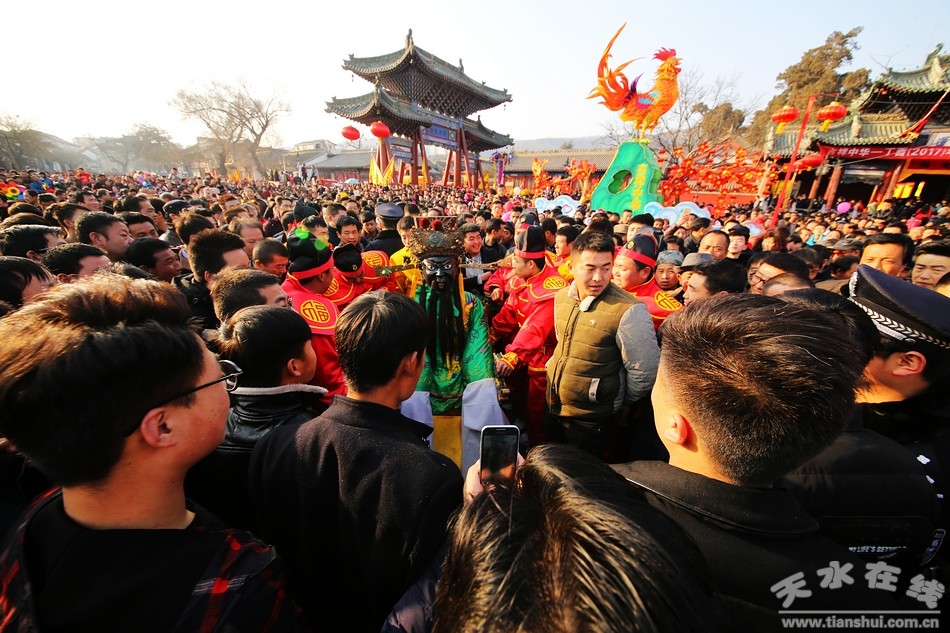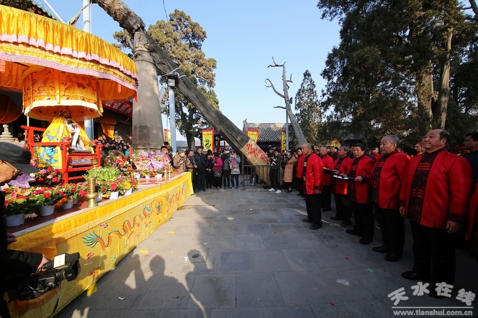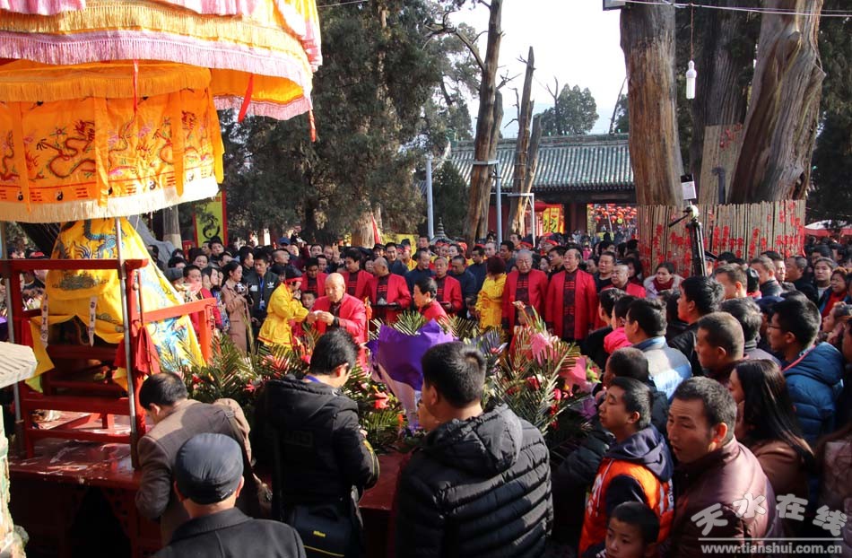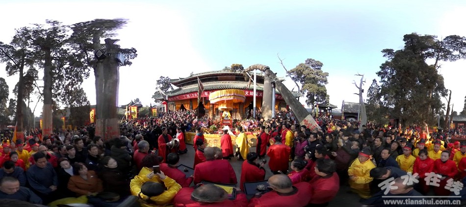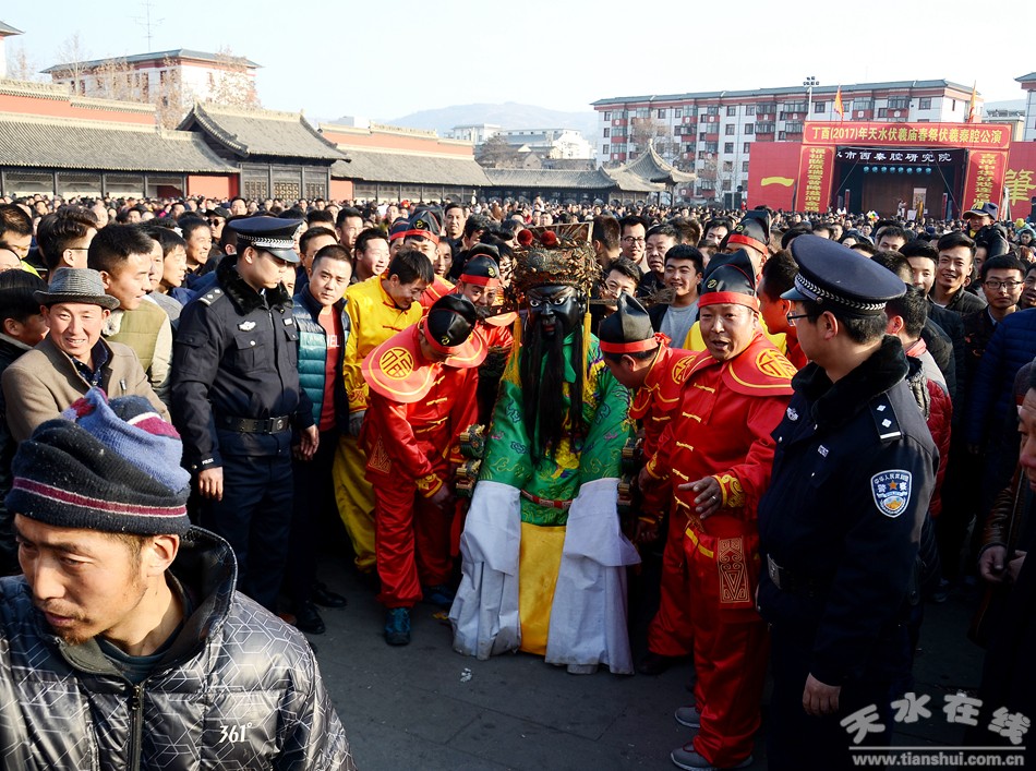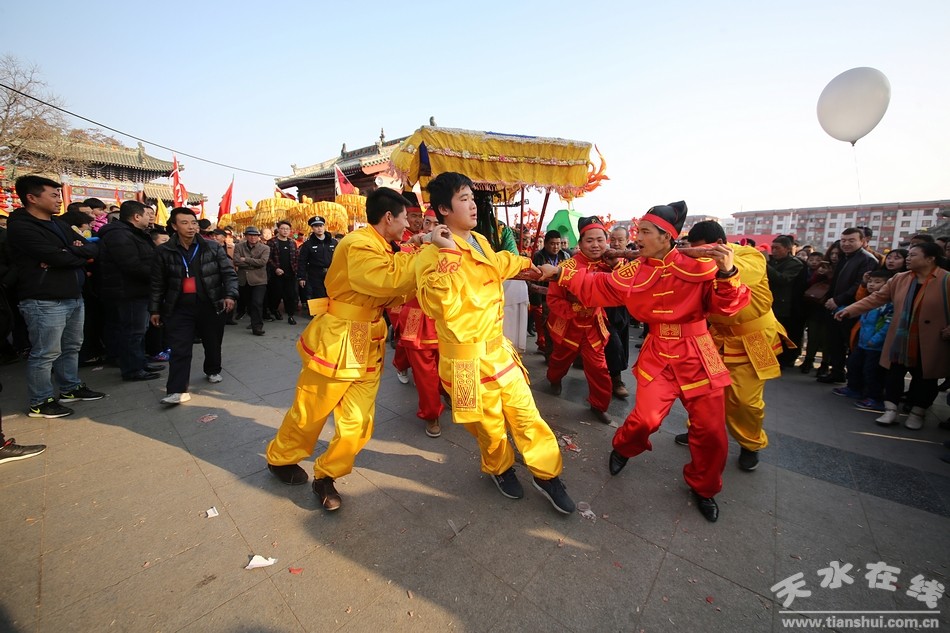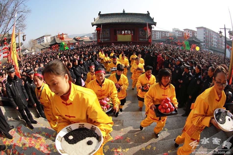 2月11日(農(nóng)歷正月十五日)下午,天水伏羲廟隆重舉行丁酉(2017)年春祭伏羲迎獻(xiàn)飯儀式。迎獻(xiàn)飯儀仗隊伍約1000多人一路走來,聲勢浩大,鼓樂喧天,參加廟會的近10萬名群眾觀看了儀式。