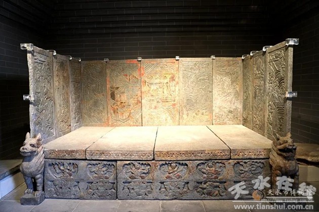 隋貼金彩繪屏風(fēng)式石棺床為國(guó)寶級(jí)文物,1982年6月發(fā)現(xiàn)于天水市秦州區(qū)石馬坪。該石棺床為砂頁巖,由床座、床板、素面石條和屏風(fēng)等26塊組成。床座正面由兩塊石板組成,分上下兩層,稱壸門,上層雕刻6個(gè)樂伎俑,分別是執(zhí)笙俑、執(zhí)銅鈸俑、彈琵琶俑、吹簫俑、手擊腰鼓俑、彈奏箜篌俑。下層壸門刻6個(gè)神獸,兩臂生翼,反掌托舉。床板為4方石板,子母扣相接,正面床沿刻有連珠忍冬紋并貼金彩繪。屏風(fēng)由11方貼金彩繪畫像石組成,其中,正面5方,兩側(cè)面各3方。石棺床圍屏的整幅畫面以主人夫婦對(duì)坐宴飲為中心,內(nèi)容和題材多為花徑長(zhǎng)廊、水榭建筑、荷花水池、亭臺(tái)樓閣、浮橋城門等建筑和自然景色,刻畫出宴飲、車馬出行、亭臺(tái)樓閣、郊游狩獵等日常生活場(chǎng)景。同時(shí),出土的還有一方墓志銘、5個(gè)座式樂伎俑和雞首壺、燭臺(tái)、金釵、石枕、銅鏡各一件。石棺床是絲路中西文化交流的產(chǎn)物,是融華風(fēng)胡俗、匯中西文化于一體的藝術(shù)精品和文化寶藏,具有濃厚祆教色彩和中國(guó)文化藝術(shù)影響的雙重特點(diǎn)。