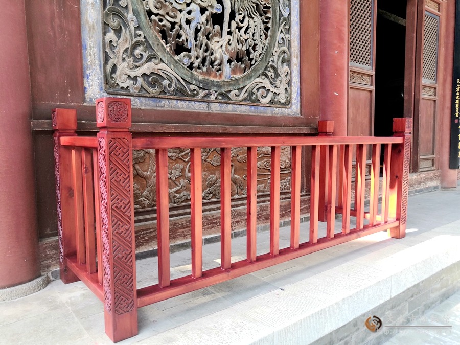 此次制作的兩組木質(zhì)圍欄,取材柏木,木質(zhì)細(xì)棉,香氣四溢。圍欄長2.8米,寬0.96米,高1.12米,有四根主柱,正面12根細(xì)柱,兩側(cè)面各3根細(xì)柱。柱頭雕龍鳳紋,柱身飾萬字紋,寓意龍鳳呈祥,福佑萬民。整體髹紅漆,顯得古典、雅致。兩組圍欄分別放置于伏羲廟太極殿團(tuán)龍、團(tuán)鳳窗欞前,不僅有效保護(hù)了古建筑木雕構(gòu)件,也為節(jié)會(huì)增添了幾分喜慶。