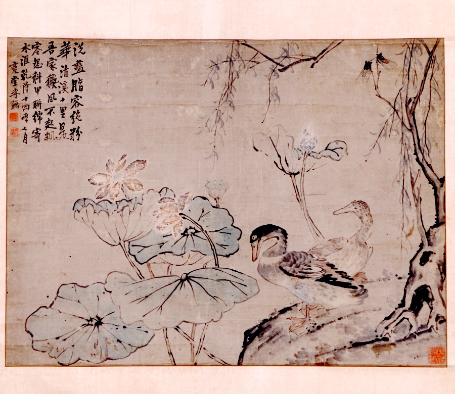 清李鱓《荷鴨圖》軸,紙本設(shè)色。此畫描繪了江蘇興化郊外十里清溪荷塘之景。左上方自題詩:“洗盡脂容絕粉華,清溪十里是吾家。秋風(fēng)不起飄零怨,科甲連綿寄水涯!甭淇睿呵∈哪昶咴拢瑥(fù)堂李鱓。下鈐“鱓印”白文印、“宗楊”朱文印,右下角鈐“李忠定文定子孫”白文印。