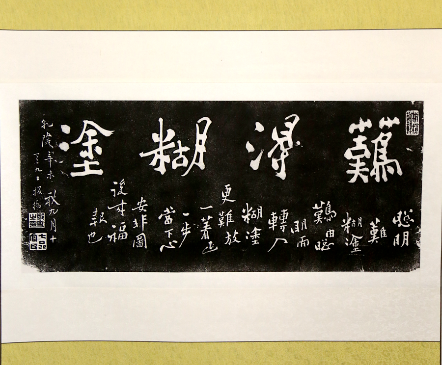鄭板橋“難得糊涂”石刻拓本條山。小字釋文:“聰明難,糊涂難,由聰明而轉(zhuǎn)入糊涂更難。放一著,退一步,當(dāng)下心安,非圖后來福報(bào)也。乾隆辛未秋九月十有九日,板橋!庇疑辖氢j“橄欖軒”朱文引首章,左下角鈐“鄭燮之印”、“七品官耳”朱文印。