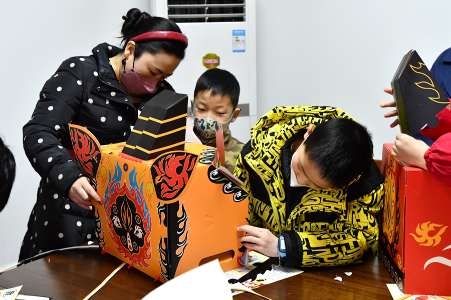 活動開始,社教專員為孩子們講解了舞龍舞獅的起源、演變、傳統(tǒng)習俗、文化內(nèi)涵和制作流程;接著開始了手工制作體驗環(huán)節(jié):孩子們應用彩紙、鈴鐺、紙箱等常見而普通的材料,用五彩的紙箱做龍的頭部,再用偏厚的紙箱做了龍身,通過剪、折、卷等不同的方式制作出了一個個生龍活虎、活靈活現(xiàn)的舞龍舞獅的形象;最后由社教專員組織同學們分為兩組,學習了舞龍舞獅行走路線要領和原地8字舞龍等基本動作技巧,通過同學們的親身體驗,感知到了舞龍舞獅的樂趣,鍛煉了孩子們的協(xié)調(diào)能力,培養(yǎng)了他們的團隊協(xié)作精神,增強了保護、傳承中華民族博大精深的民間文化有序傳承下去的激情與動力。