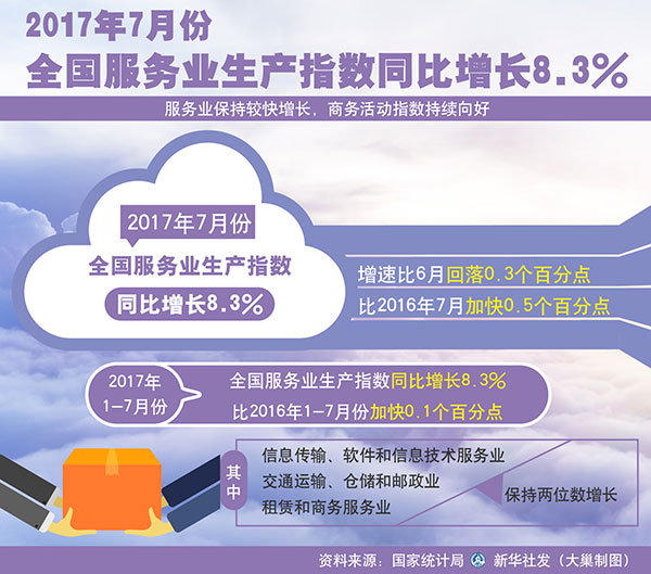 圖表:2017年7月份全國(guó)服務(wù)業(yè)生產(chǎn)指數(shù)同比增長(zhǎng)8.3% 新華社發(fā) 大巢制圖