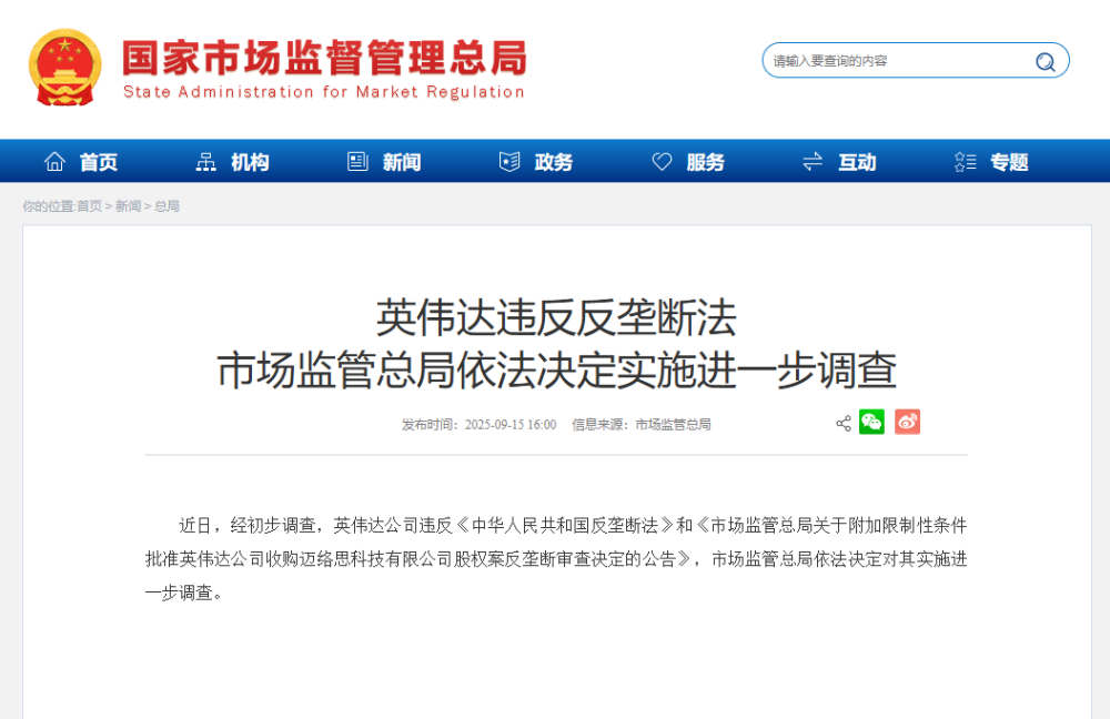 近日,經(jīng)初步調(diào)查,英偉達公司違反《中華人民共和國反壟斷法》和《市場監(jiān)管總局關于附加限制性條件批準英偉達公司收購邁絡思科技有限公司股權案反壟斷審查決定的公告》,市場監(jiān)管總局依法決定對其實施進一步調(diào)查。