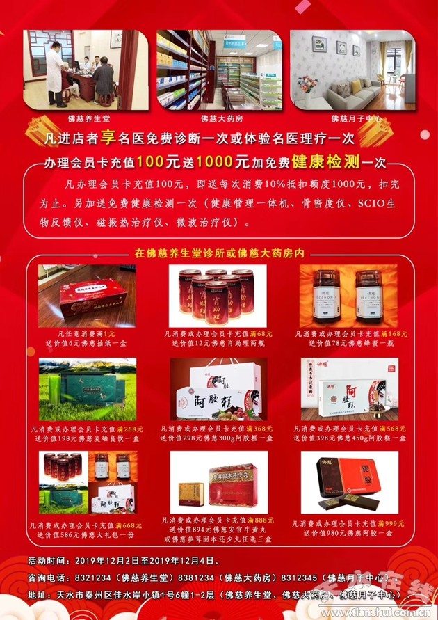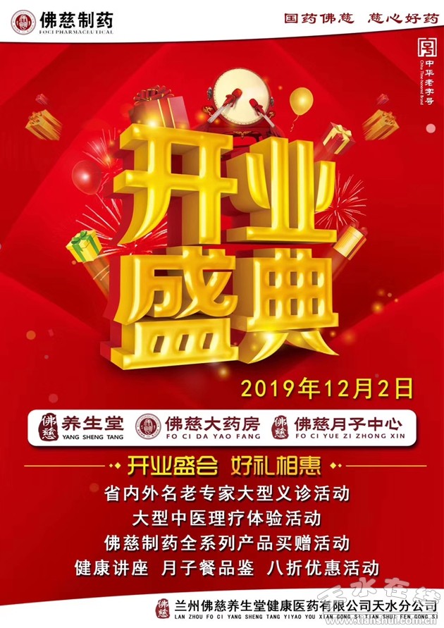 【地址】天水市秦州區(qū)佳·水岸小鎮(zhèn)1號(hào)6幢1-2層(佛慈養(yǎng)生堂,佛慈大藥房,佛慈月子中心)