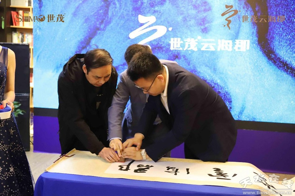 隨著出席本次發(fā)布會的幾位領(lǐng)導齊齊上臺,與現(xiàn)場所有來賓一起見證世茂天水項目的案名發(fā)布。天水本地著名書法家趙暉先生的揮毫潑墨,整個發(fā)布會的進入高潮!笆烂ぴ坪?ぁ睅讉蒼勁有力的大字躍然而出,豪邁如秦川,俊秀如藉河。世茂匠造時代,揮筆城市宏篇,以更加時代的眼光,綻放更美好的生活想象。