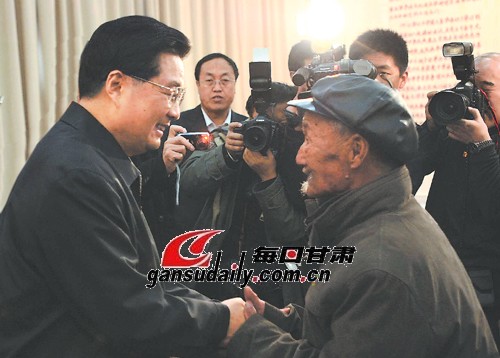 2月17日,胡錦濤總書記來到會(huì)寧縣,親切接見了當(dāng)?shù)乩霞t軍、老八路和老同志代表。