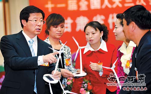 3月10日,李建華(左)代表在甘肅團(tuán)會場與其他代表就發(fā)展風(fēng)電、光能資源交換意見。本報(bào)記者呂建榮攝