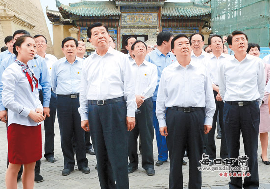 (8月25日,賈慶林在王三運、劉偉平、馮健身等陪同下,視察玉門關(guān)遺址。)