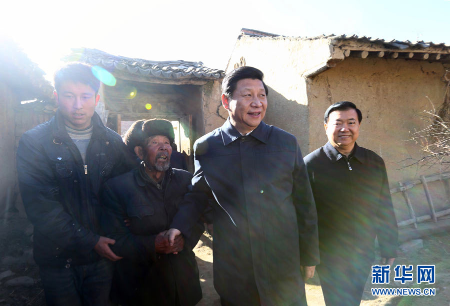 (2月3日,習(xí)近平來(lái)到定西市渭源縣田家河鄉(xiāng)元古堆村困難老黨員馬崗(左二)家中看望。 )