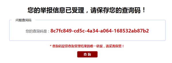舉報(bào)成功后,民眾將獲得網(wǎng)站自動(dòng)生成的查詢碼,并根據(jù)這一唯一查詢碼隨時(shí)查詢舉報(bào)內(nèi)容受理進(jìn)度。舉報(bào)中心網(wǎng)站提倡實(shí)名舉報(bào),舉報(bào)人的權(quán)益將受到嚴(yán)格保護(hù)。 |
