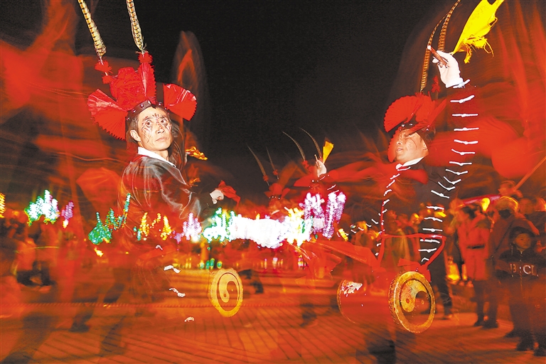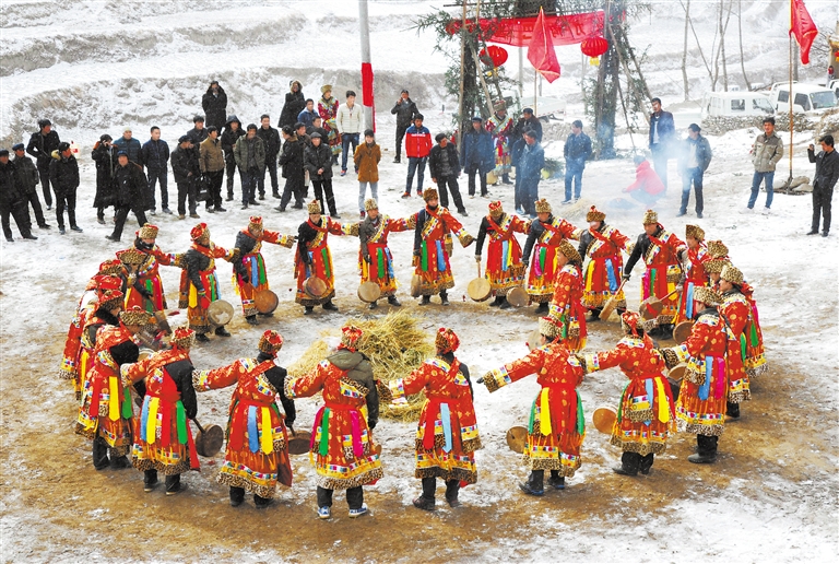 氣勢(shì)恢宏的攻鼓子如驚雷閃電,讓觀眾仿佛置身于金戈鐵馬的古戰(zhàn)場(chǎng)中;鏗鏘有力的太平鼓聲聲充盈天地,敲出了黃河兒女的豪壯之氣;腳踩高高蹺,畫上臉譜,身著戲裝,苦水高高蹺表演者時(shí)而讓人緊張刺激、時(shí)而詼諧有趣;具有濃濃鄉(xiāng)土氣息的華亭曲子戲,在黃土高原的溝溝壑壑中唱得熱熱鬧鬧;一聲聲喜慶的慶陽嗩吶洪亮清澈,聽上一曲,頓覺酣暢淋漓;富有古典特色的巴當(dāng)舞讓人如癡如醉,他們踏歌而舞,宛若進(jìn)入遙遠(yuǎn)空靈的時(shí)空中;白馬池哥晝,古樸豪放,舞步或遒勁或輕盈,頓時(shí)讓白馬河畔的村寨“歡跳”起來。這些非遺活動(dòng)形式各異,但都?xì)v史悠久,表達(dá)的是隴原人民對(duì)新春的希冀,對(duì)幸福的企盼。一場(chǎng)場(chǎng)的非遺表演,讓隴原的春節(jié)如此別致!