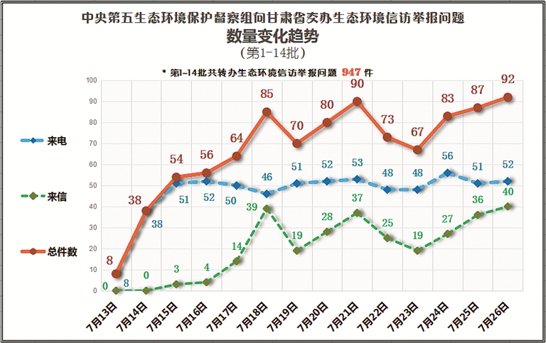 甘肅日報蘭州訊(新甘肅·甘肅日報記者文潔)7月26日,中央第五生態(tài)環(huán)境保護督察組向甘肅省移交了第十四批生態(tài)環(huán)境信訪舉報問題共92件,其中來電52件,來信40件,涉及我省14個市(州)。