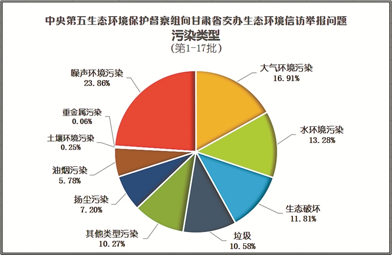 經(jīng)統(tǒng)計(jì),前十七批次轉(zhuǎn)辦的1185件生態(tài)環(huán)境信訪舉報(bào)問(wèn)題中,噪聲環(huán)境污染類(lèi)問(wèn)題占比23.86%,大氣環(huán)境污染類(lèi)問(wèn)題占比16.91%,水環(huán)境污染類(lèi)問(wèn)題占比13.28%,生態(tài)破壞類(lèi)問(wèn)題占比11.81%,垃圾類(lèi)問(wèn)題占比10.58%,揚(yáng)塵污染類(lèi)問(wèn)題占比7.20%,油煙污染類(lèi)問(wèn)題占比5.78%,土壤環(huán)境污染類(lèi)問(wèn)題占比0.25%,重金屬污染類(lèi)問(wèn)題占比0.06%,其他類(lèi)型占比10.27%。