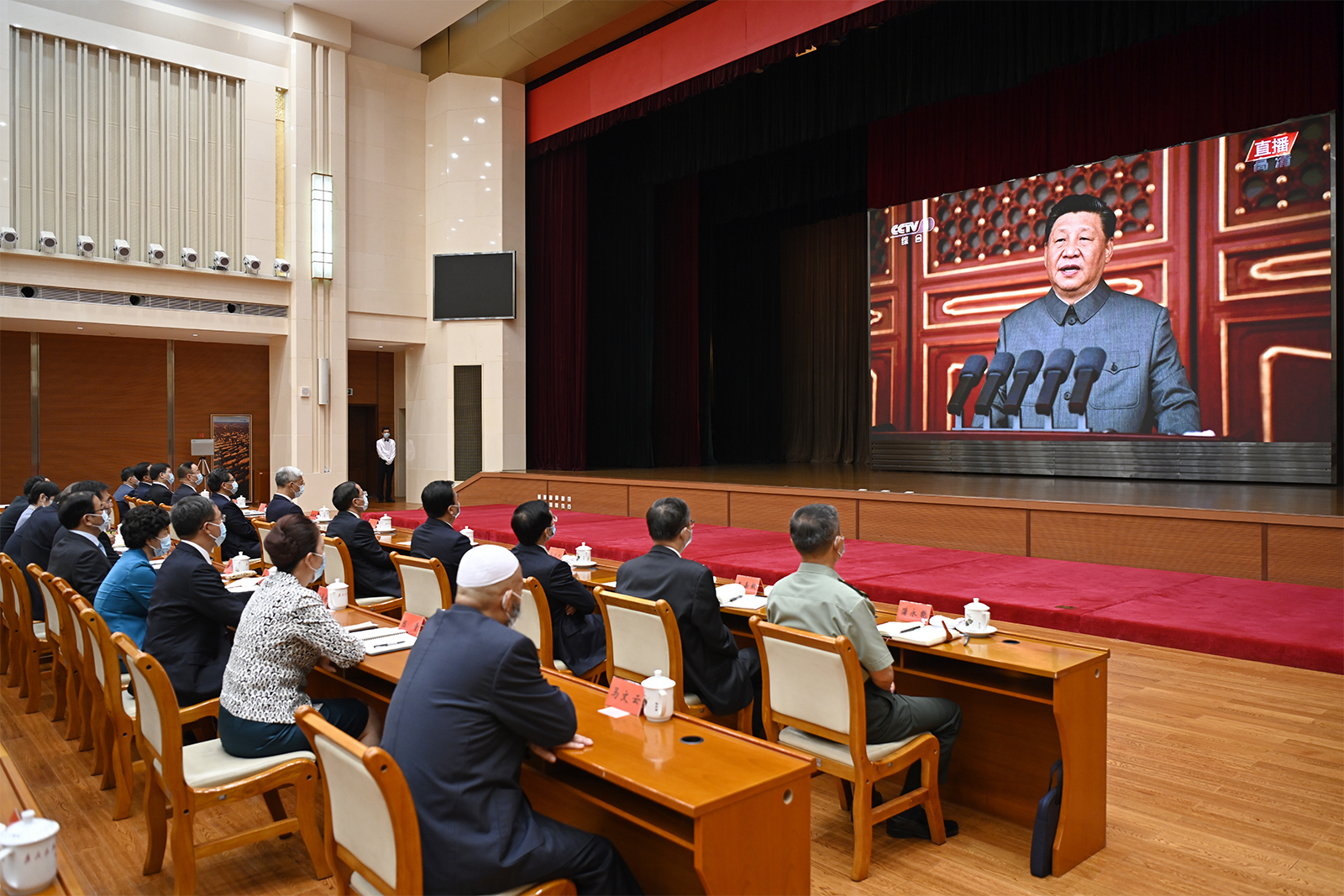 7時(shí)53分許,在歡快的樂曲聲中,習(xí)近平等黨和國(guó)家領(lǐng)導(dǎo)人來到天安門城樓主席臺(tái),會(huì)場(chǎng)爆發(fā)出熱烈的掌聲。8時(shí)整,慶祝大會(huì)開始,中國(guó)人民解放軍聯(lián)合軍樂團(tuán)奏響雄壯的《義勇軍進(jìn)行曲》,尹弘、任振鶴等全體起立,隨北京現(xiàn)場(chǎng)一起高唱中華人民共和國(guó)國(guó)歌,目視大屏幕里鮮艷奪目的五星紅旗冉冉升起,在天安門廣場(chǎng)上空迎風(fēng)飄揚(yáng)。在熱烈的掌聲中,習(xí)近平總書記發(fā)表重要講話,大家認(rèn)真聆聽、專心筆記,第一時(shí)間深刻學(xué)習(xí)領(lǐng)會(huì),不時(shí)報(bào)以熱烈的掌聲。