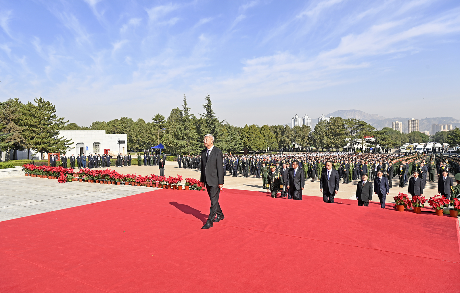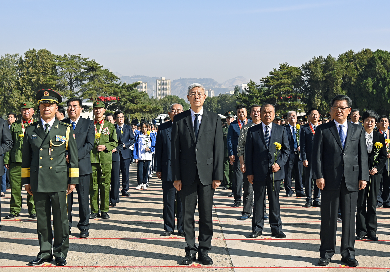 尹弘、任振鶴等領(lǐng)導(dǎo)同志拾級而上,在花籃前駐足凝視。朵朵鮮花,寄托著對人民英雄的深切緬懷和崇高敬意。