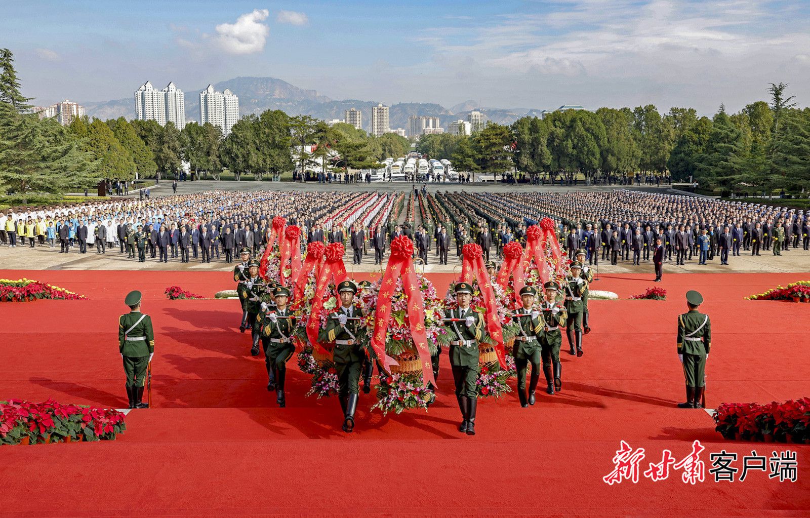 人員方陣前,以中共甘肅省委、省人大常委會(huì)、省政府、省政協(xié)、駐甘人民解放軍和武警部隊(duì)、民主黨派、中共蘭州市委、蘭州市政府、蘭州社會(huì)各界群眾名義敬獻(xiàn)的9個(gè)大型花籃一字排開,紅色緞帶上“人民英雄永垂不朽”金色大字熠熠生輝。