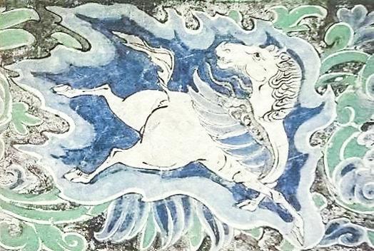 在榆林窟第10窟壁畫中有一幅繪于西夏的“午馬圖”:畫面上不是普通的駿馬,而是一匹疾馳在空中的天馬。它身帶雙翼,四圍纖云弄巧,銀漢迢迢。天馬的馬尾高聳、回頭遠(yuǎn)眺。龍馬精神,代表著中華民族自強(qiáng)不息、奮發(fā)向上的精神。人們常用“千里馬”來形容有才能的人。馬以其高雅的姿態(tài)和美麗的外貌受到廣泛的贊美和喜愛。唐朝詩人李賀有著名的23首《馬詩》,最耳熟能詳?shù)氖恰按竽橙缪,燕山月似鉤。何當(dāng)金絡(luò)腦,快走踏清秋!币馑际钦f平沙萬里在月光下像鋪上一層白皚皚的霜雪。連綿的燕山山嶺上,一彎明月當(dāng)空,如彎鉤一般。什么時(shí)候才能給它戴上金絡(luò)頭,在秋高氣爽的疆場(chǎng)上馳騁,建立功勛呢?敦煌壁畫中的這匹生肖馬,代指了自強(qiáng)不息。