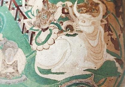 在莫高窟第360窟壁畫中有一幅繪于中唐的“丑牛圖”:這是一頭健碩魁梧、神情安詳、外貌華麗的白牛。牛角傲然獨(dú)立、牛目圓睜、悠然斜臥。令人不由得想起當(dāng)代大詩人臧克家的詩句“老牛自知夕陽晚,不須揚(yáng)鞭自奮蹄”。意思是說勤勉一生的老牛,自知來日苦短。它勞作了一天后靜臥于夕陽的光輝里,暗下決心,不用主人揚(yáng)鞭就要拼全力向前奔跑!