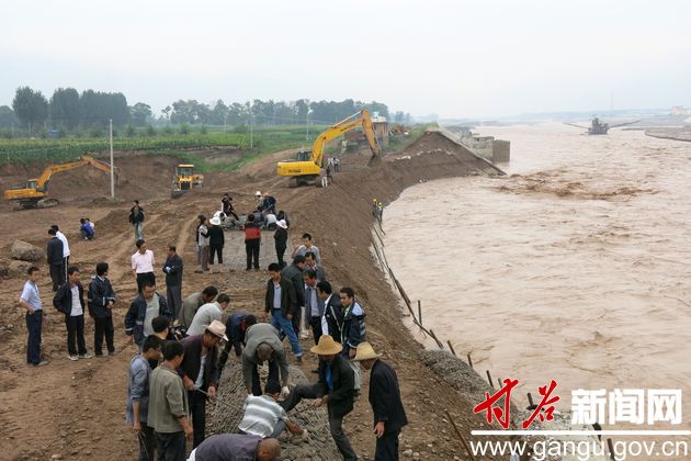 在施工現(xiàn)場(chǎng),記者看到,由于持續(xù)數(shù)天的暴雨導(dǎo)致渭河河水持續(xù)暴漲,河水沖刷河堤,導(dǎo)致河堤損壞。昨晚凌晨12時(shí),縣上主要領(lǐng)導(dǎo)在現(xiàn)場(chǎng)勘探情況并召開專題會(huì)議,制定了河堤修復(fù)搶險(xiǎn)方案?h直相關(guān)部門及鄉(xiāng)鎮(zhèn)干部,當(dāng)?shù)厝罕娺B夜組織施工,各類大型工程車、運(yùn)輸車來回穿梭,各種防洪石、預(yù)制板、鉛絲籠、麻袋等防汛物資堆滿一地。一袋袋防洪石及一批批其他防洪物資由大型工程機(jī)械填充到被洪水沖毀的河堤缺口處。經(jīng)過數(shù)百名搶險(xiǎn)人員晝夜戰(zhàn)斗,有效阻止了險(xiǎn)情的進(jìn)一步蔓延。