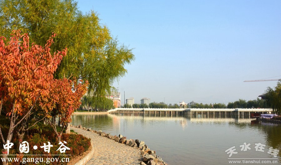 初冬時節(jié),漫步甘谷縣大像山公園,拱橋湖水相映成趣,奇花異樹色彩斑斕,一股厚重雄渾、靜謐靈動的氣息撲面而來。