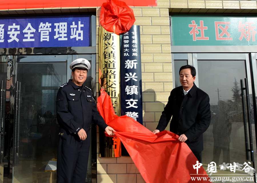 (市交警支隊副支隊長許維正和縣委常委、常務副縣長孟曉龍為新興鎮(zhèn)交管站交警中隊揭牌)