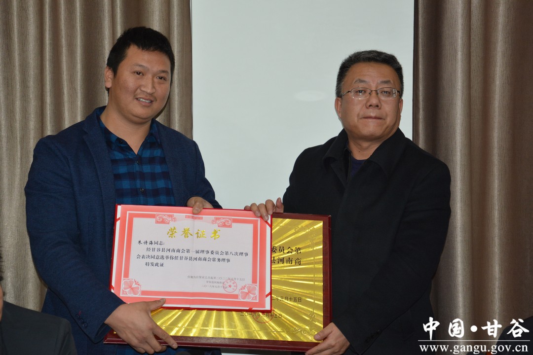 座談會上,王剛作了講話,王剛、謝興明分別為新增選甘谷縣河南商會第一屆理事委員會常務(wù)理事朱詩海、時林頒發(fā)了榮譽(yù)證書;甘谷縣河南商會副會長崔威炯作了工作報告。