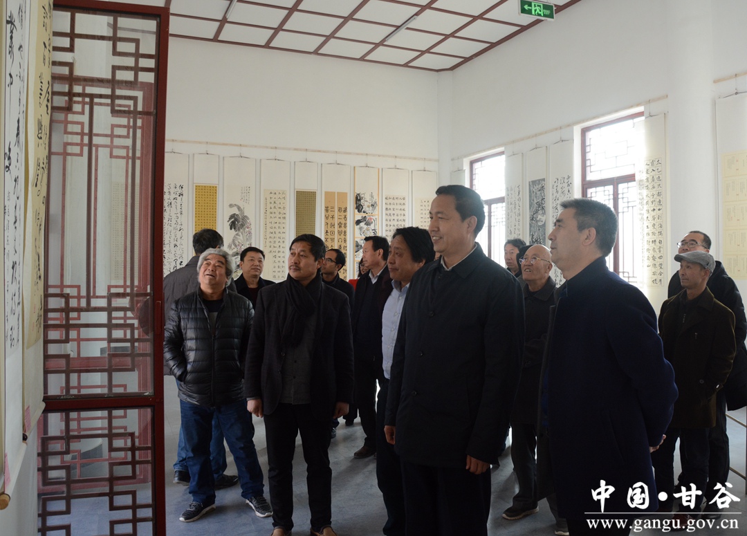 2月26日,甘谷縣2018年迎新春書畫作品展在大像山景區(qū)游客服務(wù)中心開展。縣委常委、宣傳部長張慶元,縣人大常委會(huì)副主任王金生,縣政協(xié)副主席馬清平出席開展儀式并與干部群眾一起參觀展覽。