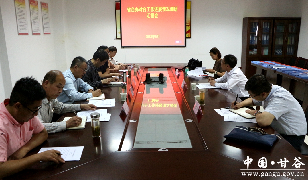 隨后召開調(diào)研座談會,市、縣兩級臺辦負(fù)責(zé)人向調(diào)研組匯報了對臺工作進(jìn)展情況。調(diào)研組對我縣對臺工作取得的成績給予充分肯定,要求在今后工作中,要加強(qiáng)同省、市臺辦及臺胞臺屬的聯(lián)系交流,鼓勵和引導(dǎo)在臺甘谷籍人士來家鄉(xiāng)投資興業(yè)、共謀發(fā)展,不斷促進(jìn)甘谷縣與臺灣更多更廣的交流交往;同時要準(zhǔn)確把握兩岸關(guān)系發(fā)展新形勢,不斷加強(qiáng)對臺宣傳工作,積極開展群眾性涉臺教育活動,深入推進(jìn)涉臺教育進(jìn)機(jī)關(guān)、進(jìn)鄉(xiāng)鎮(zhèn)、進(jìn)社區(qū)、進(jìn)校園活動,努力營造全社會共同關(guān)心,支持和參與對臺工作的良好氛圍。
