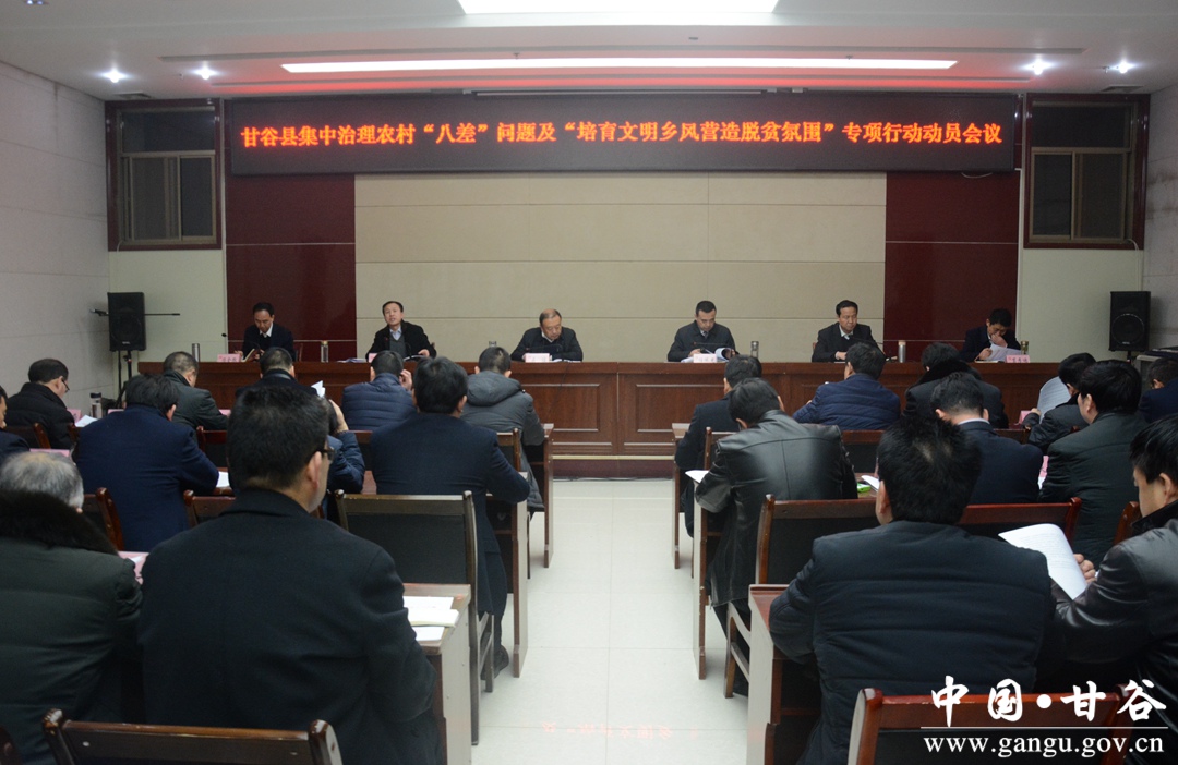 1月10日,甘谷縣召開(kāi)集中治理農(nóng)村“八差”問(wèn)題暨“培育文明鄉(xiāng)風(fēng)營(yíng)造脫貧氛圍”專(zhuān)項(xiàng)行動(dòng)動(dòng)員會(huì),貫徹落實(shí)市委、市政府相關(guān)部署要求,全面啟動(dòng)治理農(nóng)村“八差”問(wèn)題和“培育文明鄉(xiāng)風(fēng)營(yíng)造脫貧氛圍”專(zhuān)項(xiàng)行動(dòng),動(dòng)員全縣上下提高政治站位,強(qiáng)化責(zé)任擔(dān)當(dāng),集中力量開(kāi)展攻堅(jiān)行動(dòng),徹底改善鄉(xiāng)村面貌和群眾精神風(fēng)貌,為打贏打好脫貧攻堅(jiān)戰(zhàn)、實(shí)施鄉(xiāng)村振興戰(zhàn)略提供有力保障。
