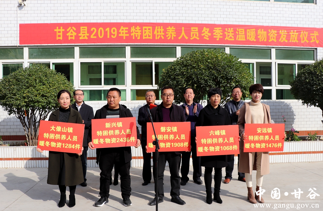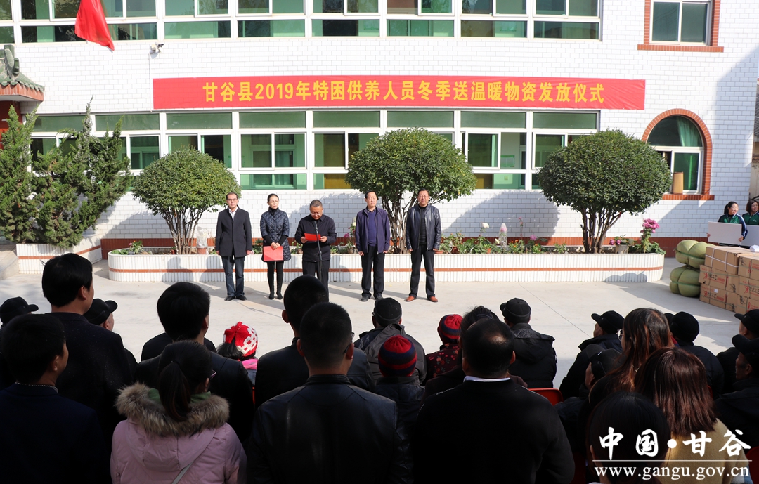 11月15日,甘谷縣2019年特困供養(yǎng)人員冬季送溫暖物資發(fā)放儀式在縣中心敬老院舉行?h委常委、統(tǒng)戰(zhàn)部長(zhǎng)王剛,縣人大常委會(huì)副主任薛希武,副縣長(zhǎng)高麗,縣政協(xié)副主席陳旭出席發(fā)放儀式;各鄉(xiāng)鎮(zhèn)分管領(lǐng)導(dǎo)、民政助理員,縣中心敬老院特困老人,共70多人參加發(fā)放儀式。