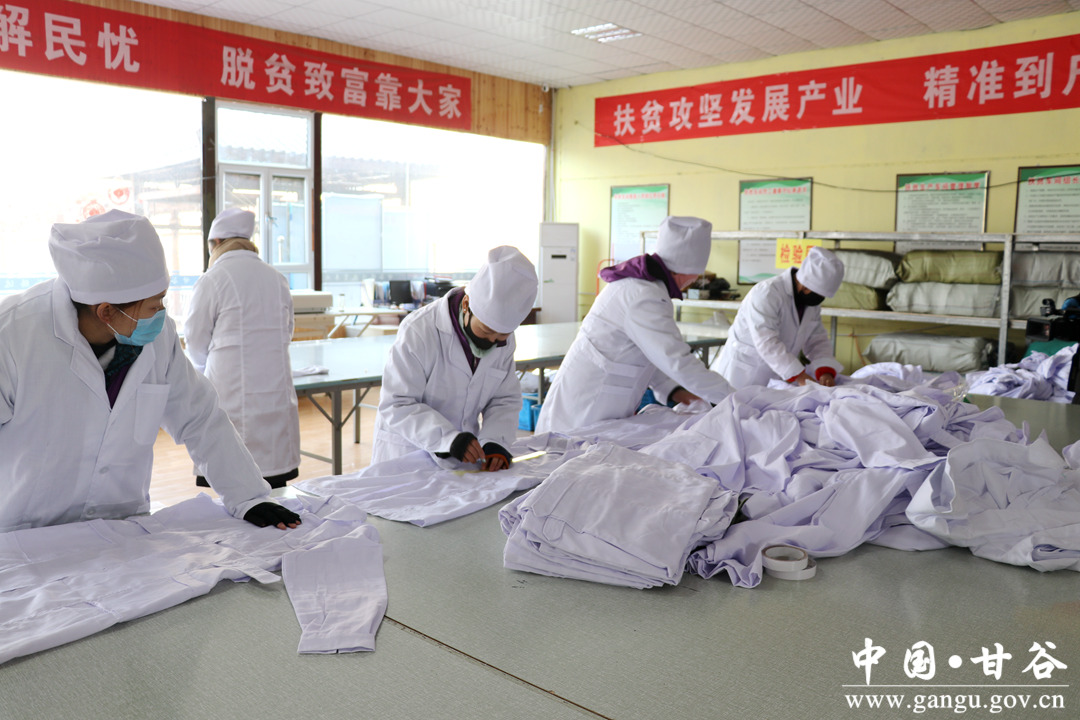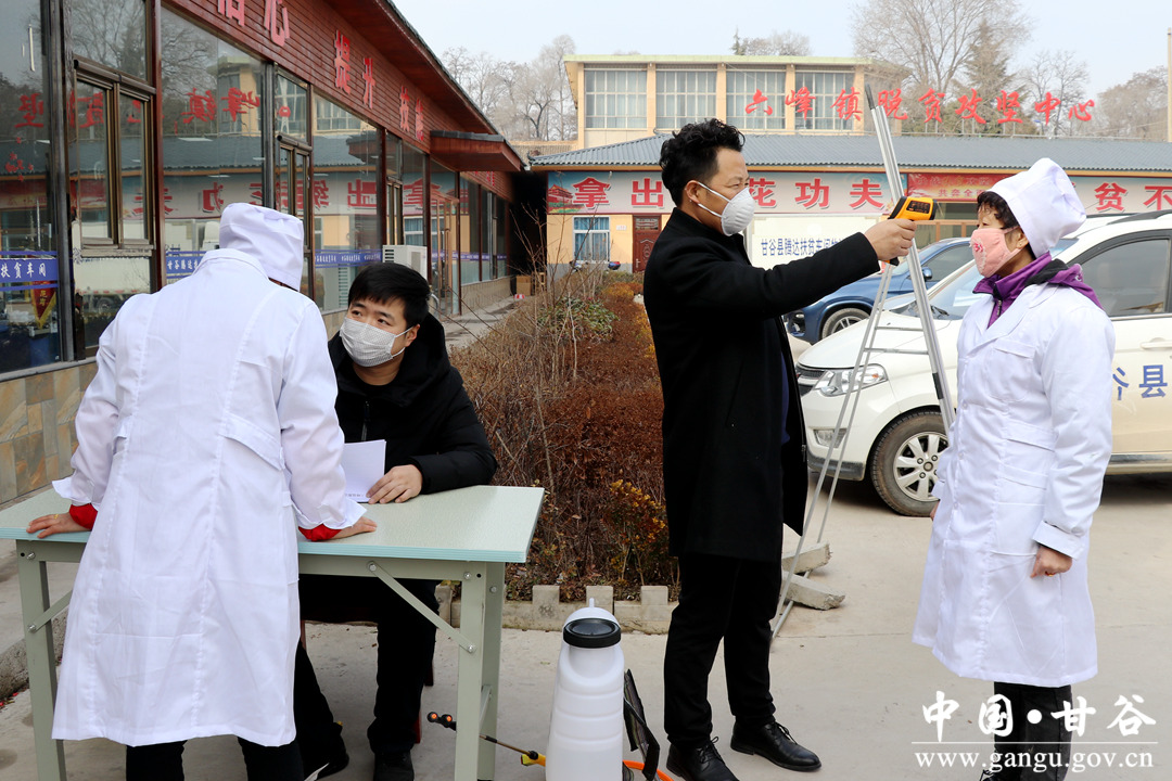 2月13日,甘谷縣六峰扶貧車間工人們身著工作服,佩戴口罩,排隊(duì)依次通過(guò)體溫檢測(cè)、消毒后,正式投入復(fù)工復(fù)產(chǎn)。