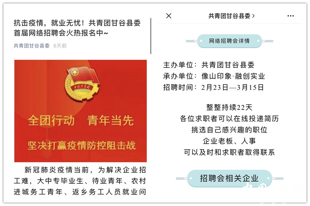 二是積極搭建用工平臺。為了解決用工企業(yè)招工難的問題,團縣委牽頭主辦了甘谷縣“像山印象·融創(chuàng)實業(yè)”杯首屆網(wǎng)絡(luò)招聘會,招聘會從求職者和用工企業(yè)需求出發(fā),足不出戶完成用工企業(yè)和待就業(yè)群體的招聘應(yīng)聘。截止2月28日,招聘會訪問量超1.2萬人次,已為16家企業(yè)提供線上招聘服務(wù)。在此基礎(chǔ)上,在“像山印象·雙創(chuàng)一條街”掛牌成立了共青團就業(yè)扶助服務(wù)工作站,為未就業(yè)群體提供線上線下就業(yè)幫助,使有轉(zhuǎn)移就業(yè)愿望和能力的城鄉(xiāng)青年實現(xiàn)轉(zhuǎn)移就業(yè)。