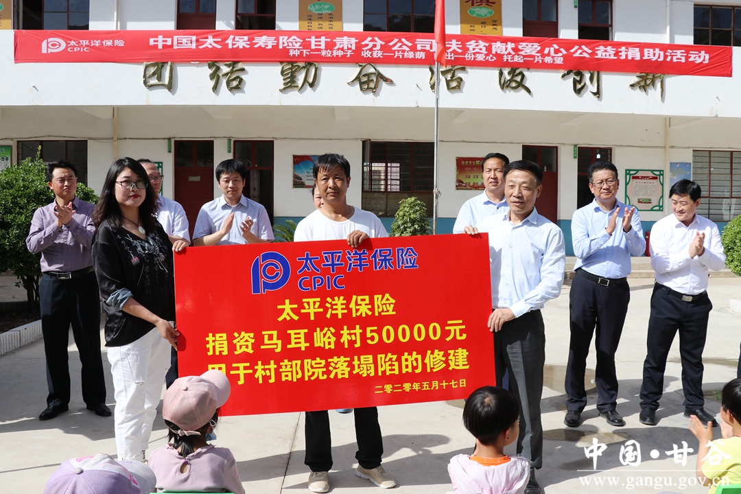 5月17日,中國(guó)太平洋壽險(xiǎn)甘肅分公司黨委書記、總經(jīng)理劉炳奎一行在精準(zhǔn)扶貧幫扶村甘谷縣八里灣鎮(zhèn)馬耳峪村開展扶貧獻(xiàn)愛心公益捐助活動(dòng)。縣委常委、宣傳部部長(zhǎng)張慶元出席捐助儀式。