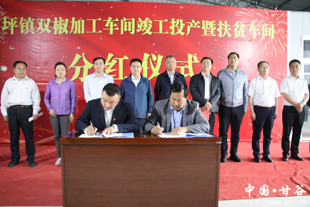 扶貧車間負責人向石坪村集體、未脫貧戶和監(jiān)測戶進行了分紅。在村民代表們的見證下,扶貧車間(泓峰辣椒加工廠)代表與村集體經(jīng)濟代表簽訂了辣椒加工車間分紅協(xié)議。周顏忠宣布辣椒加工車間正式竣工投產(chǎn)。
