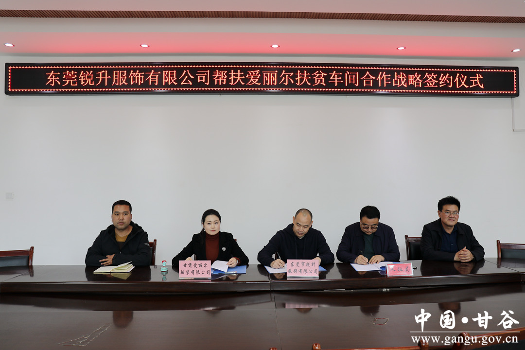 10月19日,東莞市銳升服飾有限公司、愛麗爾扶貧車間戰(zhàn)略合作簽約儀式在甘谷縣舉行,甘谷縣人力資源和社會(huì)保障局負(fù)責(zé)人,東莞市銳升服飾有限公司總經(jīng)理、愛麗爾扶貧車間總經(jīng)理現(xiàn)場簽訂了三方協(xié)議。