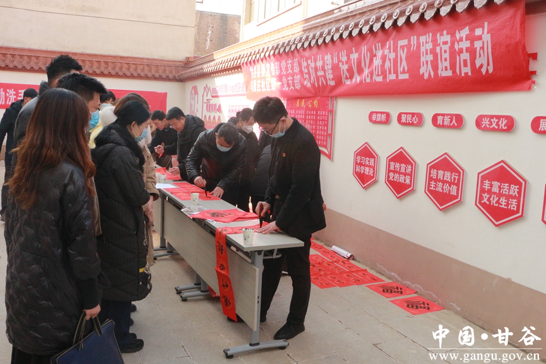 在“送文化進社區(qū)”聯(lián)誼活動現(xiàn)場,縣委宣傳部特邀的書法家們揮毫潑墨,筆走龍蛇,為現(xiàn)場黨員群眾書寫了一幅幅寓意美好,吉祥喜慶的春聯(lián)和“!弊,為父老鄉(xiāng)親們送上新春佳節(jié)的美好祝愿。