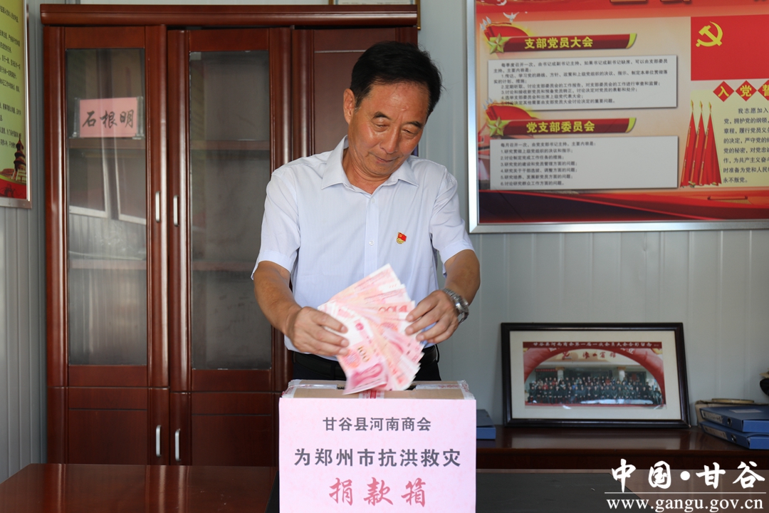 甘谷縣河南商會黨支部書記、會長姚振明告訴記者,得知我們的故鄉(xiāng)遭受百年不遇的洪水災害,家鄉(xiāng)親人們生命和財產受到了損失,我們商會迅速組織起來召開了會長會議,向各位豫商企業(yè)家們發(fā)出捐款支持老家抗災倡議,各位老鄉(xiāng)紛紛表示捐款支持,在很短的時間里我們商會捐款一萬多元支持家鄉(xiāng)災后重建,使我們家鄉(xiāng)的親人們盡早恢復平安、幸福的工作生活。