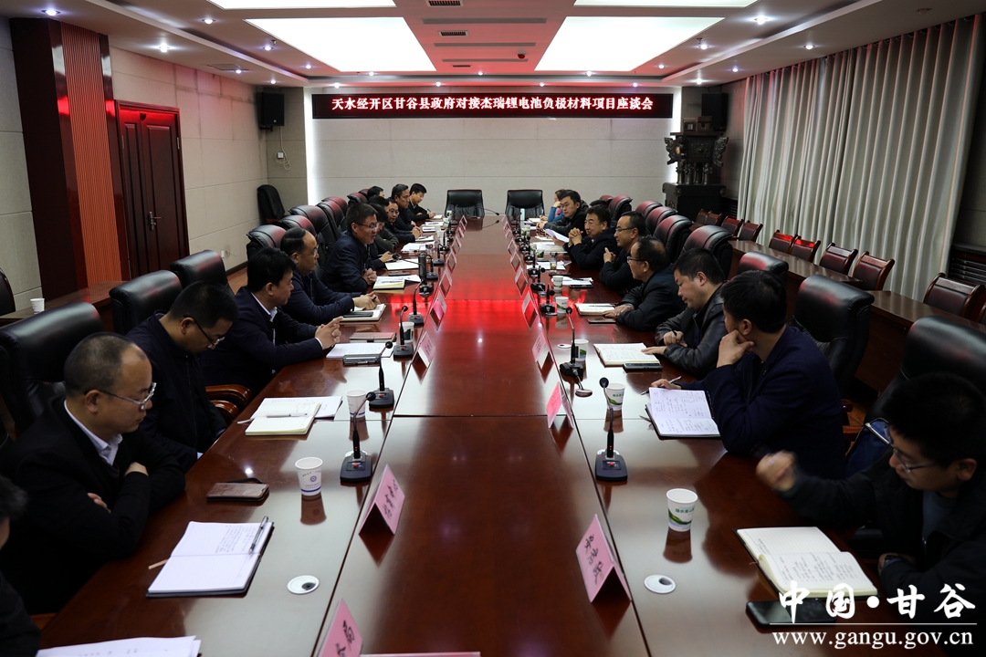 10月14日,天水經(jīng)濟(jì)技術(shù)開(kāi)發(fā)區(qū)黨工委書記、管委會(huì)主任胡亞軍一行來(lái)甘谷縣對(duì)接杰瑞鋰電池負(fù)極材料項(xiàng)目工作?h委副書記、代縣長(zhǎng)孫忠平,副縣長(zhǎng)范慧出席座談會(huì)。