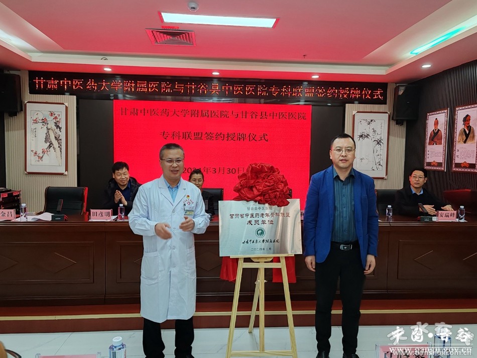 新甘谷訊【記者郭金龍】3月30日,甘肅中醫(yī)藥大學(xué)附屬醫(yī)院與甘谷縣中醫(yī)醫(yī)院?坡(lián)盟簽約授牌儀式在甘谷縣中醫(yī)醫(yī)院舉行,甘肅中醫(yī)藥大學(xué)附屬醫(yī)院謝興文團(tuán)隊一行14名專家、縣衛(wèi)健局分管領(lǐng)導(dǎo),縣中醫(yī)院領(lǐng)導(dǎo)班子及職工代表、各鄉(xiāng)鎮(zhèn)衛(wèi)生院醫(yī)療骨干等70余人參會。