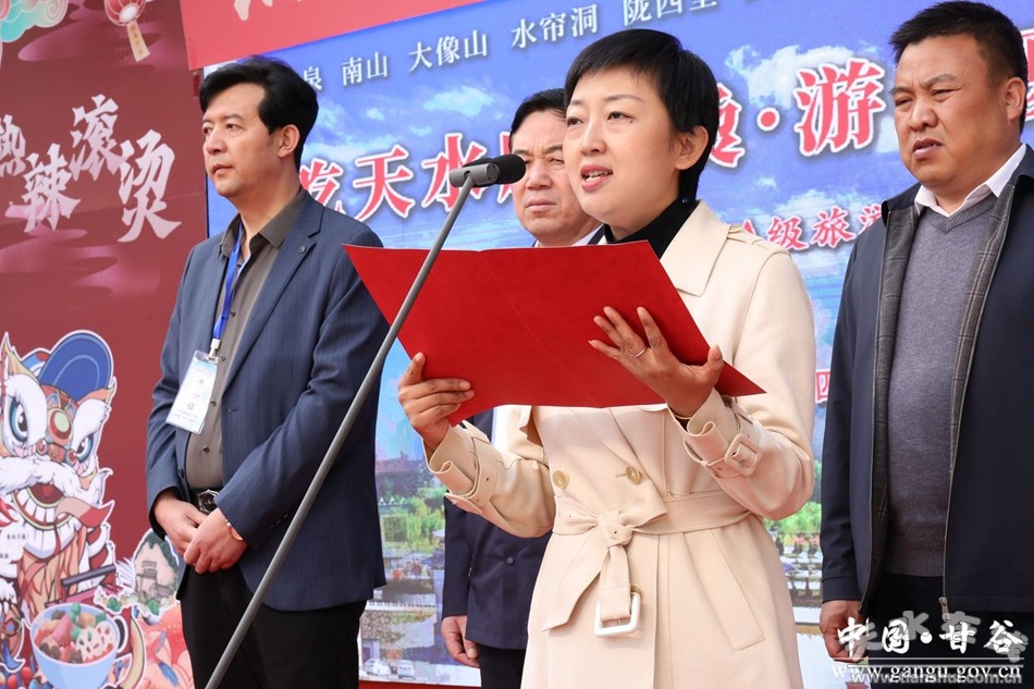 范慧在致辭中說(shuō),當(dāng)前,“天水麻辣燙”火熱全網(wǎng),定西寬粉、甘谷辣椒火爆“出圈”。一碗粉帶火一座城,一座城帶火一個(gè)省,一個(gè)省擰成一股繩,“省級(jí)統(tǒng)籌、市縣聯(lián)動(dòng)”的文旅資源宣傳推介機(jī)制,正在推動(dòng)甘肅厚重多彩的歷史文化,成為我們最具魅力的標(biāo)識(shí)!希望各兄弟縣區(qū)搶抓這波流量熱度,立足各自資源稟賦、發(fā)揮品牌優(yōu)勢(shì),在素有“華夏第一縣”美譽(yù)的甘谷開(kāi)展深度推介;并通過(guò)推出10個(gè)國(guó)家4A級(jí)景區(qū)一票互通等多項(xiàng)“寵粉”政策,積極開(kāi)展引流活動(dòng),齊心協(xié)力提升區(qū)域歷史人文、美景美食、地方特產(chǎn)知名度、吸引力。更希望天南海北的游客朋友們,在吃完麻辣燙、游完麥積山后,來(lái)一場(chǎng)說(shuō)走就走的旅行,領(lǐng)略大西北的獨(dú)特魅力,感受天水定西毗鄰縣區(qū)的質(zhì)樸熱情。