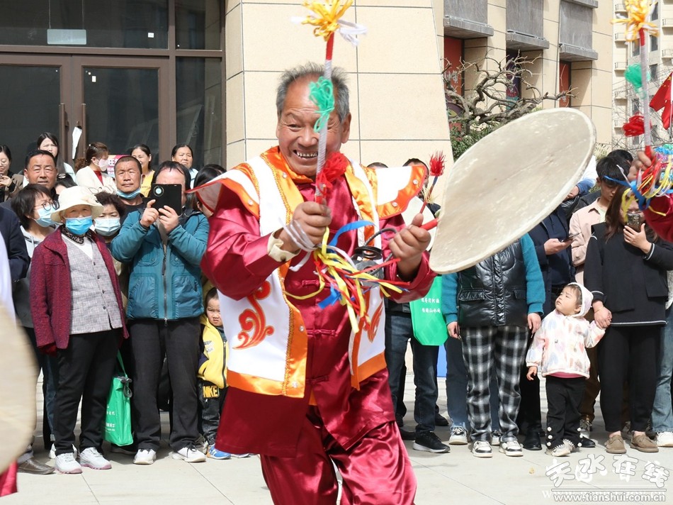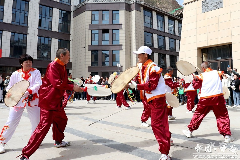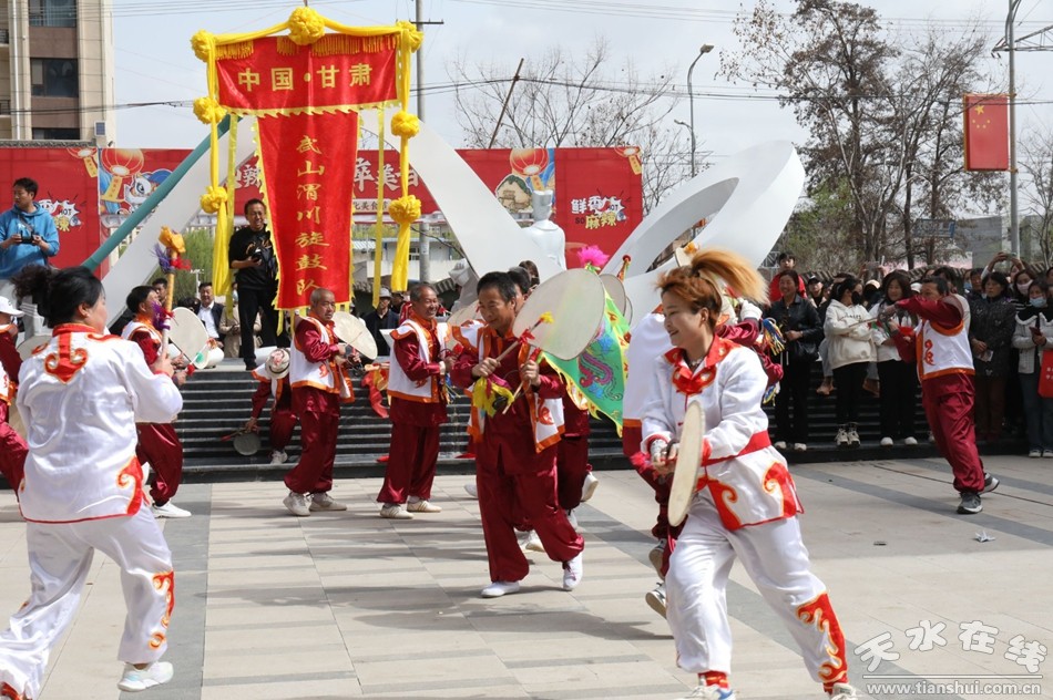 啟動(dòng)儀式后,來(lái)自武山縣的旋鼓舞和武術(shù)表演點(diǎn)燃全場(chǎng)。國(guó)家級(jí)非遺武山旋鼓舞,鼓點(diǎn)節(jié)奏千變?nèi)f化,舞者動(dòng)作剛健雄壯,陣型變換中整齊劃一,舞出了武山人民的真性情,舞出了武山人民的精氣神。展演者帥氣旋轉(zhuǎn)的身姿,行云流水的動(dòng)作,受到現(xiàn)場(chǎng)觀眾的喜愛(ài),現(xiàn)場(chǎng)歡呼聲、喝彩聲不斷。