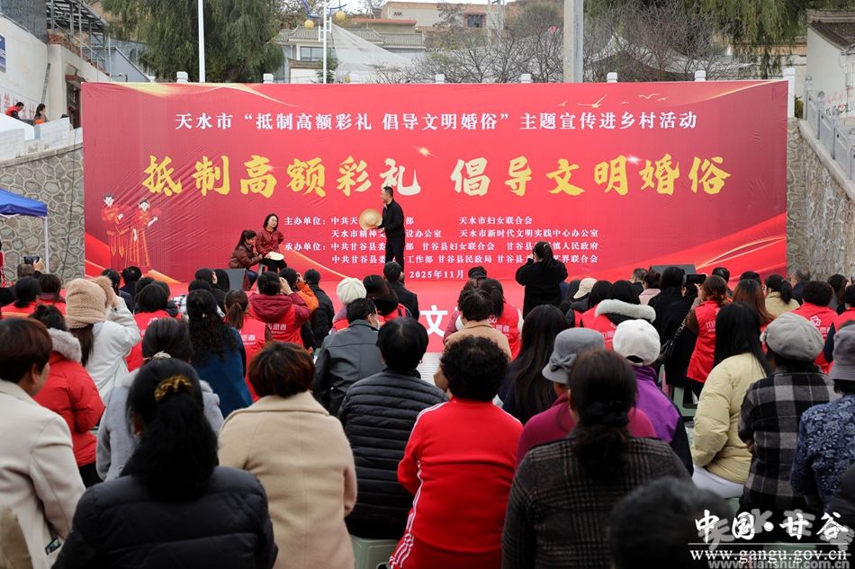 新甘谷訊【記者李宛郁】11月12日,由天水市委宣傳部、市婦聯(lián)、市文明辦、市新時代文明實踐中心辦公室聯(lián)合舉辦的天水市“抵制高額彩禮倡導文明婚俗”主題宣傳進鄉(xiāng)村活動在甘谷縣新興鎮(zhèn)孫家坪村舉行。這場別開生面的主題宣傳進鄉(xiāng)村活動,憑借歡快的文藝演出、趣味的知識互動、貼心的便民服務與暖心的文化贈送,讓200多名鄉(xiāng)親在歡聲笑語中,卸下了高額彩禮的沉重負擔,筑牢了文明婚俗的思想根基。