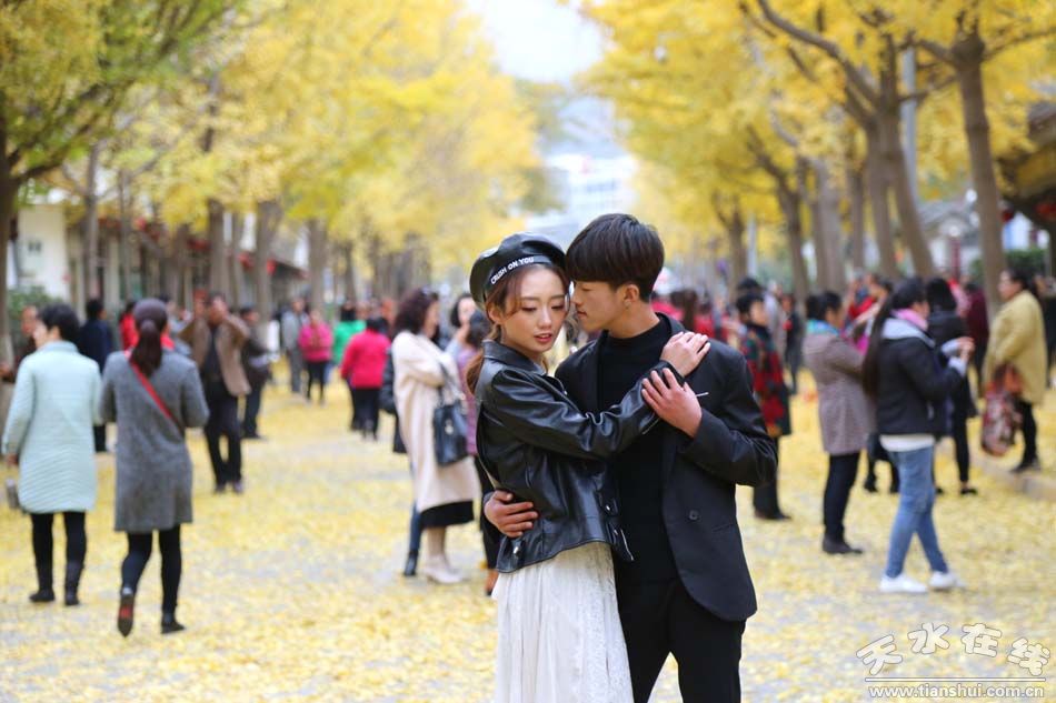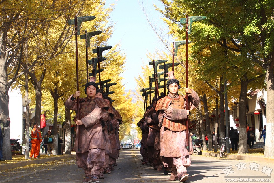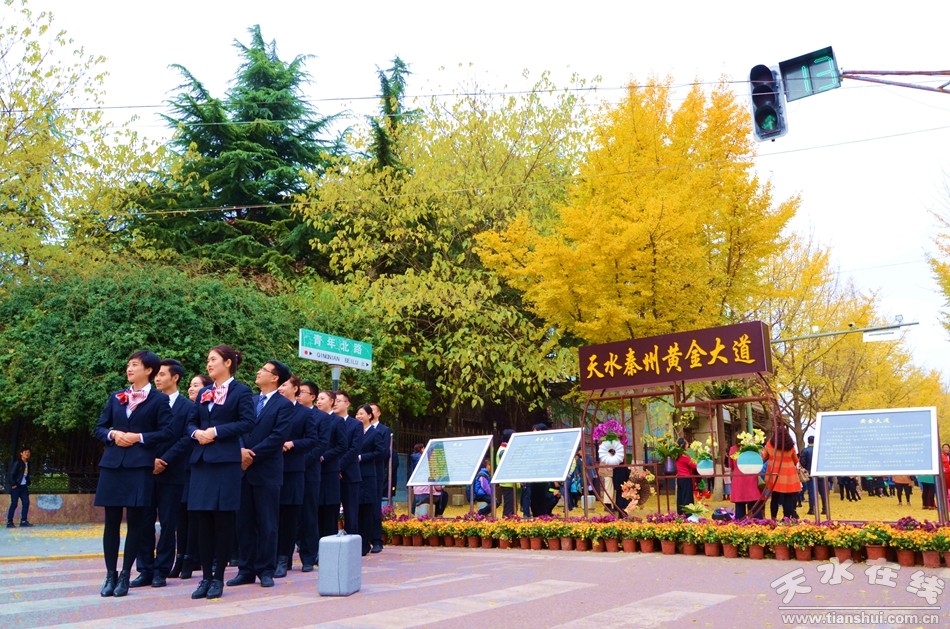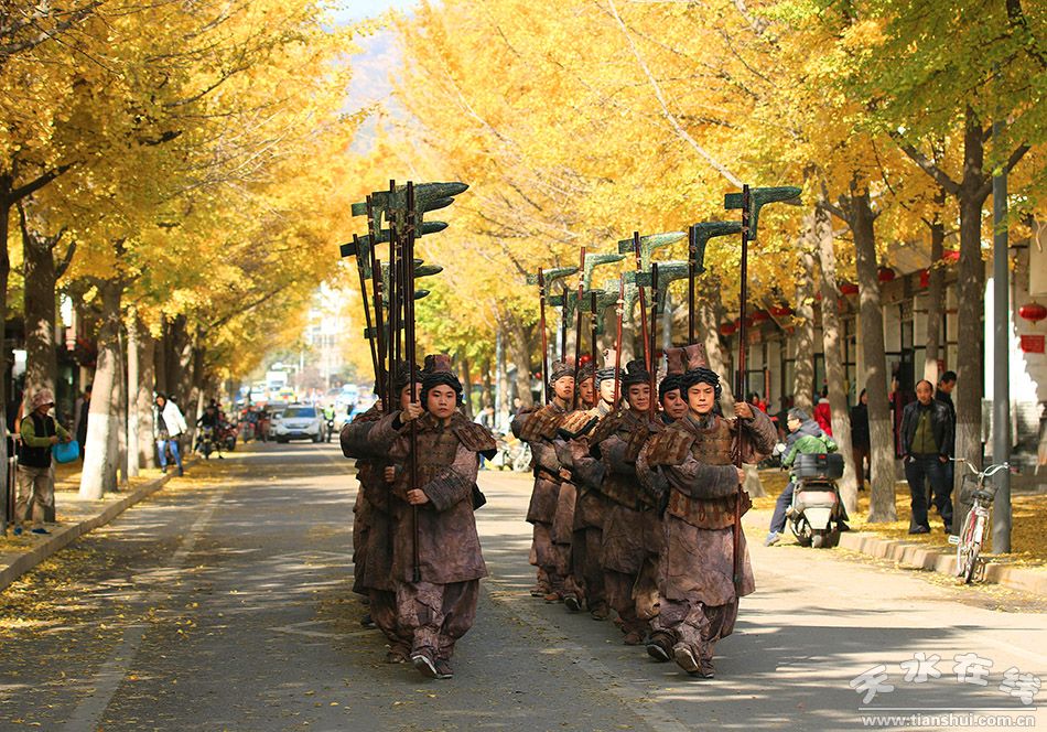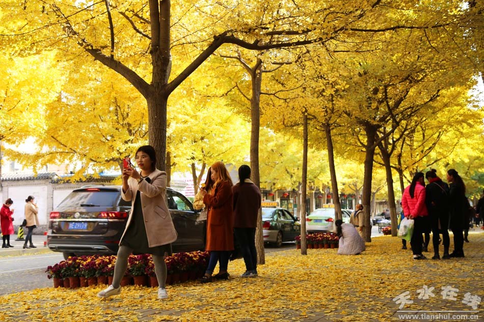 但對于銀杏扎堆的天水市秦州區(qū)青年北路來說,這卻不是第一次充當舞臺。本月7日,由天水市秦劇團演員扮演的20名“大秦勇士”,手持金戈第一次在此“登臺”,開啟了今年全市銀杏觀賞熱潮。本月8日,這里被官方正式命名為“黃金大道”,成為主題街道。9日,秦州區(qū)政府以便民為初衷宣布對該路全段臨時封閉3天,希望市民在這里可以無憂無慮的“美個夠”。