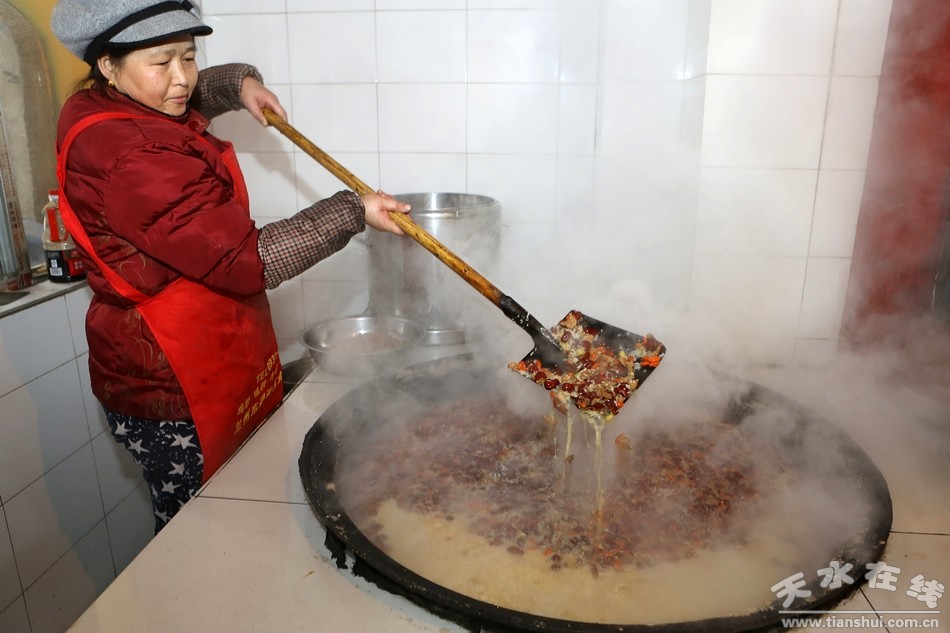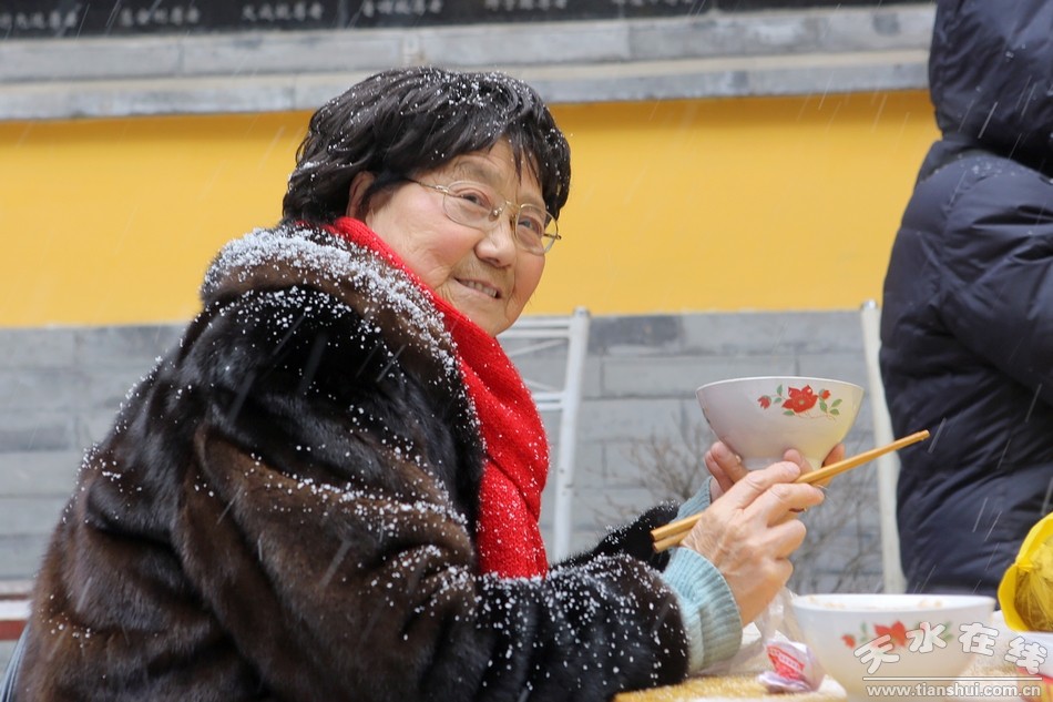 1月24日,臘月初八,雖然天氣寒冷,瑞雪飄飄,然而在天水瑞蓮寺卻是一片吉祥喜慶的氣氛。潔白的雪花,落在寺院的屋頂上,落在地上,落在人們的衣服,甚至眉捎上,給今年的臘八增添了一種瑞雪兆豐年的別樣情趣。在瑞蓮寺喝臘八粥已逐漸成為天水市民一種比較具有特色的民俗之一,每年臘八節(jié)都會吸引了大量的市民和游客前來喝粥祈福。這里人頭攢動,法號陣陣,佛樂悠揚,人們在這里虔誠拜佛,祈求國泰民安。今年的臘八節(jié)更勝以往。